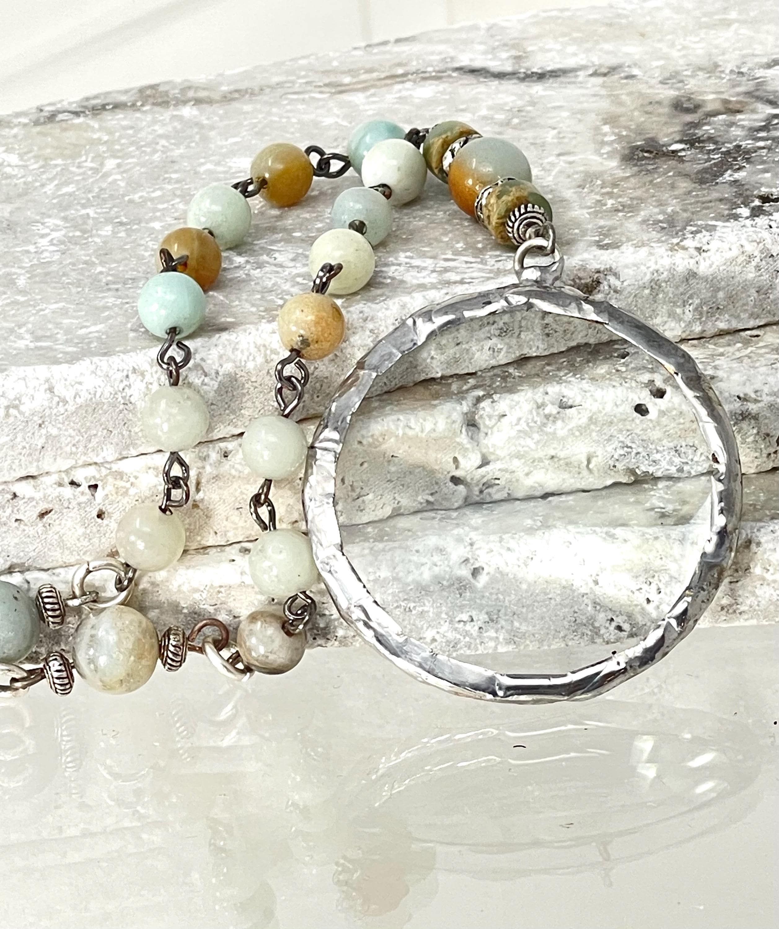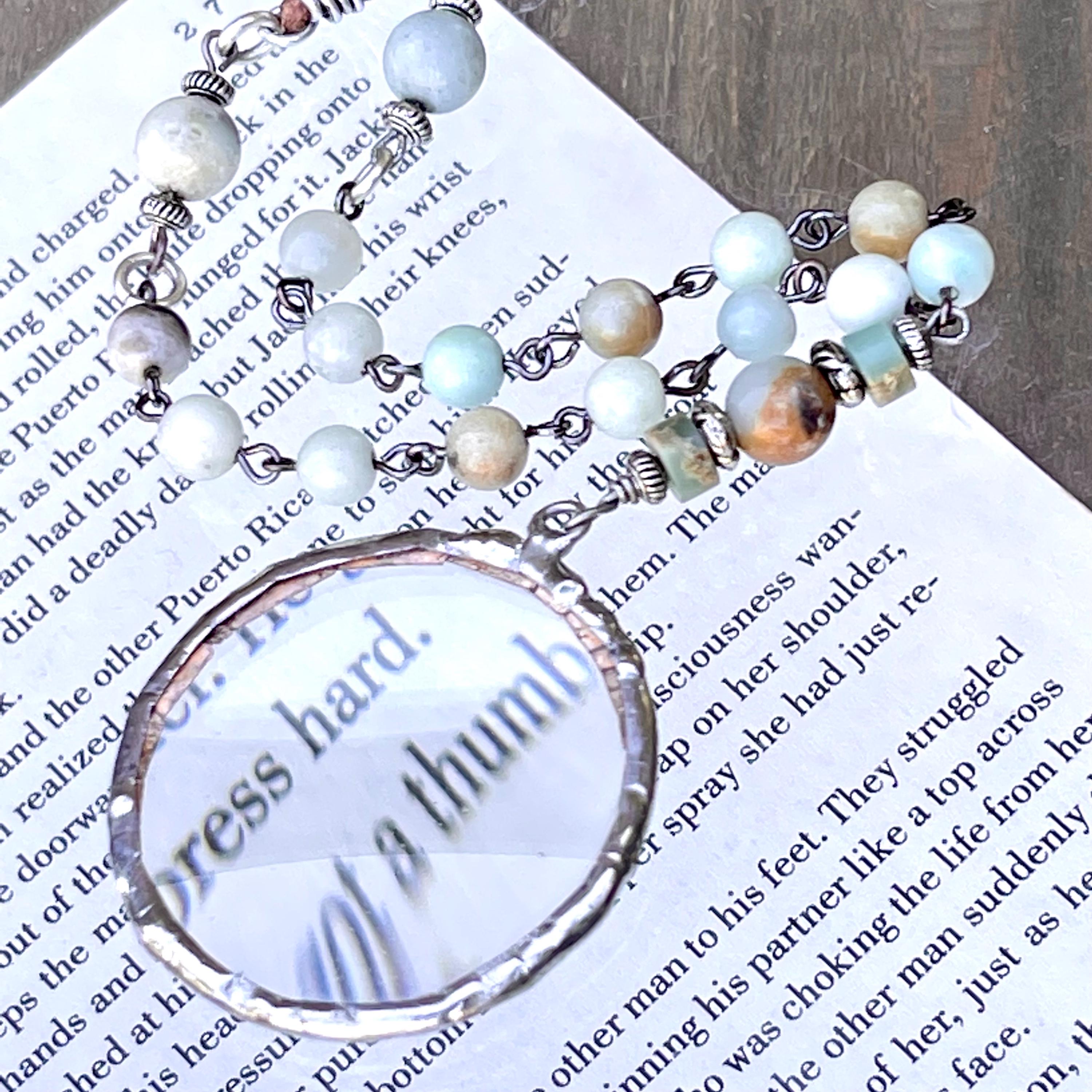 The magnifying glass and pendant hang on a 30” Amazonite gemstone and leather chain.
