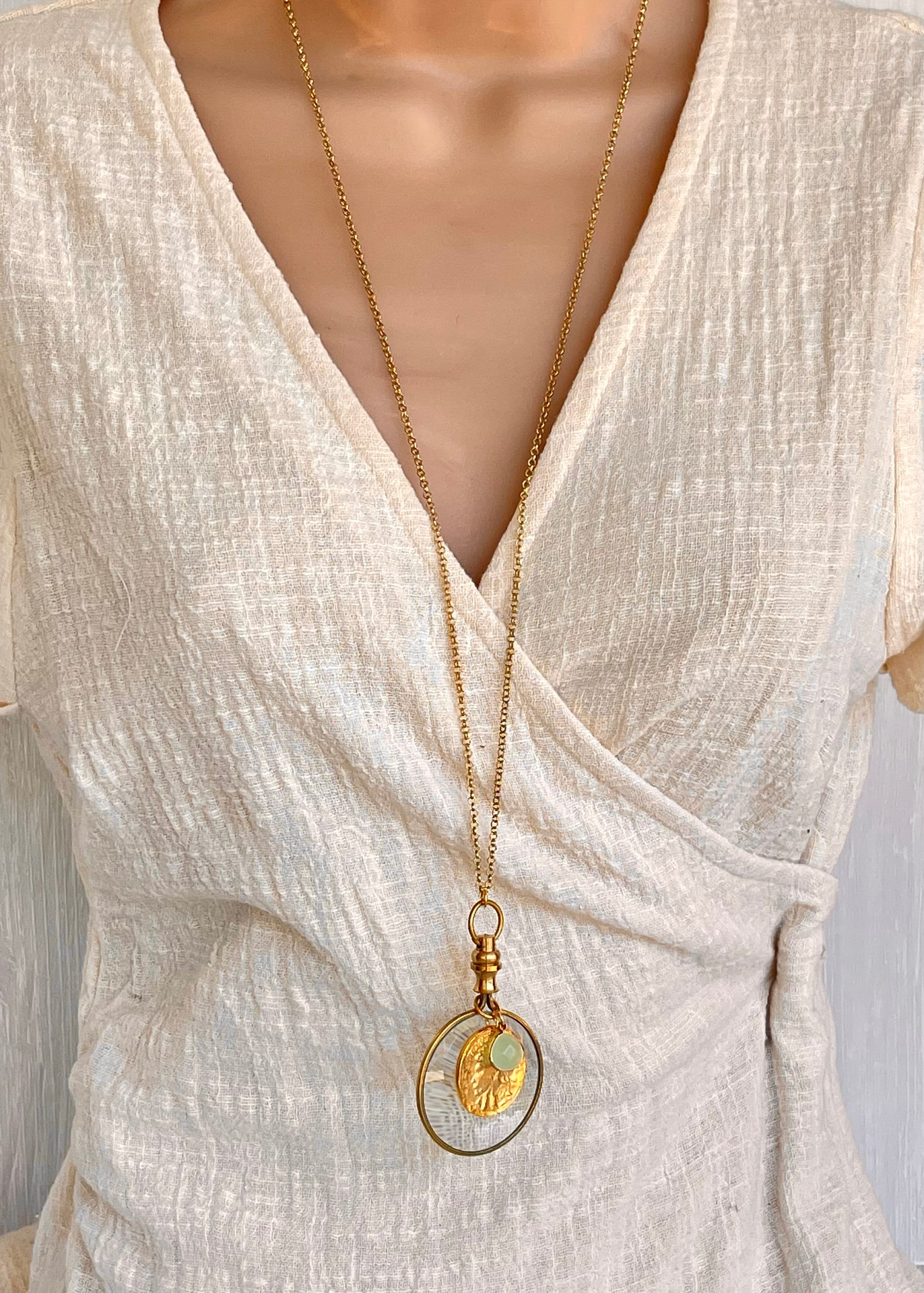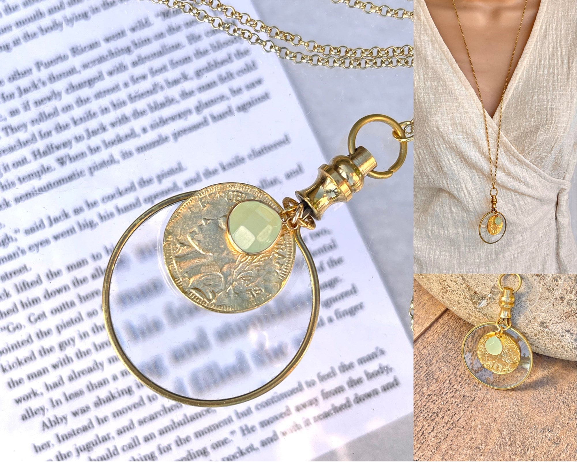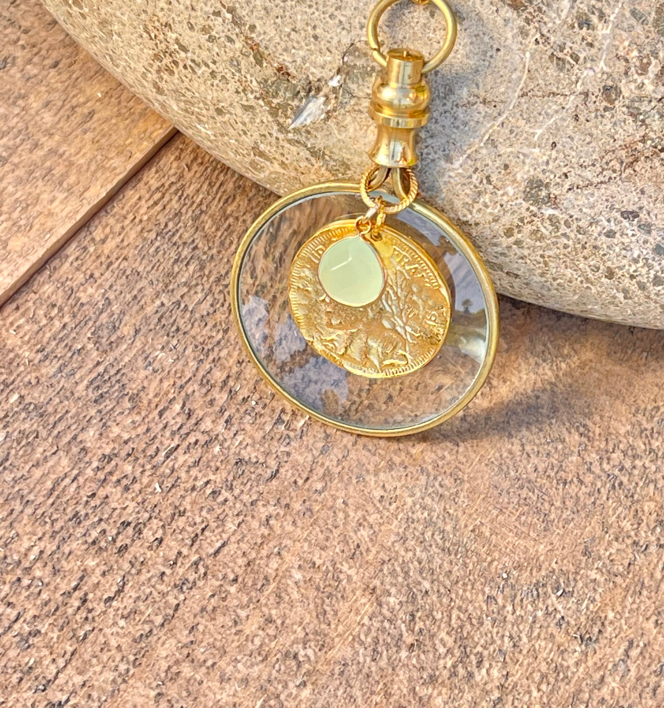 This gold toned brass magnifying glass necklace is not only fashionable it is also convenient for viewing your phone, menus, price tags, etc. So leave your reading glasses at home because this is your modern solution to the monocle.