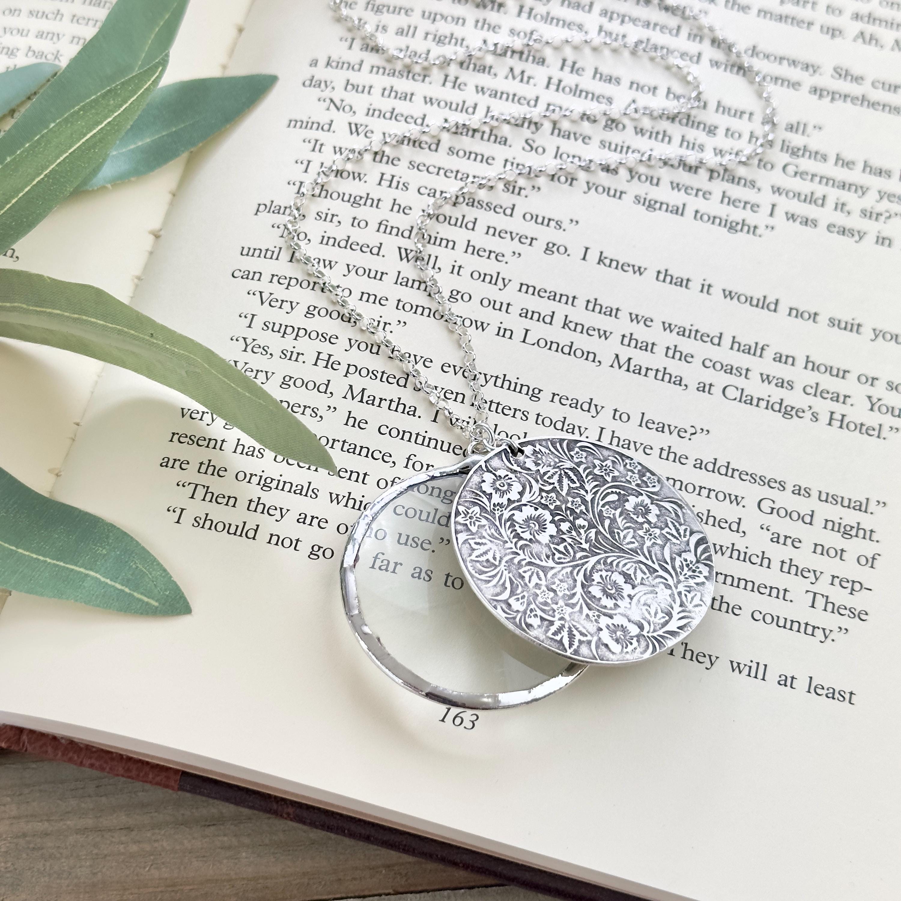 The silver framed magnifying glass and pendant hang on a 30” .925 silver chain.