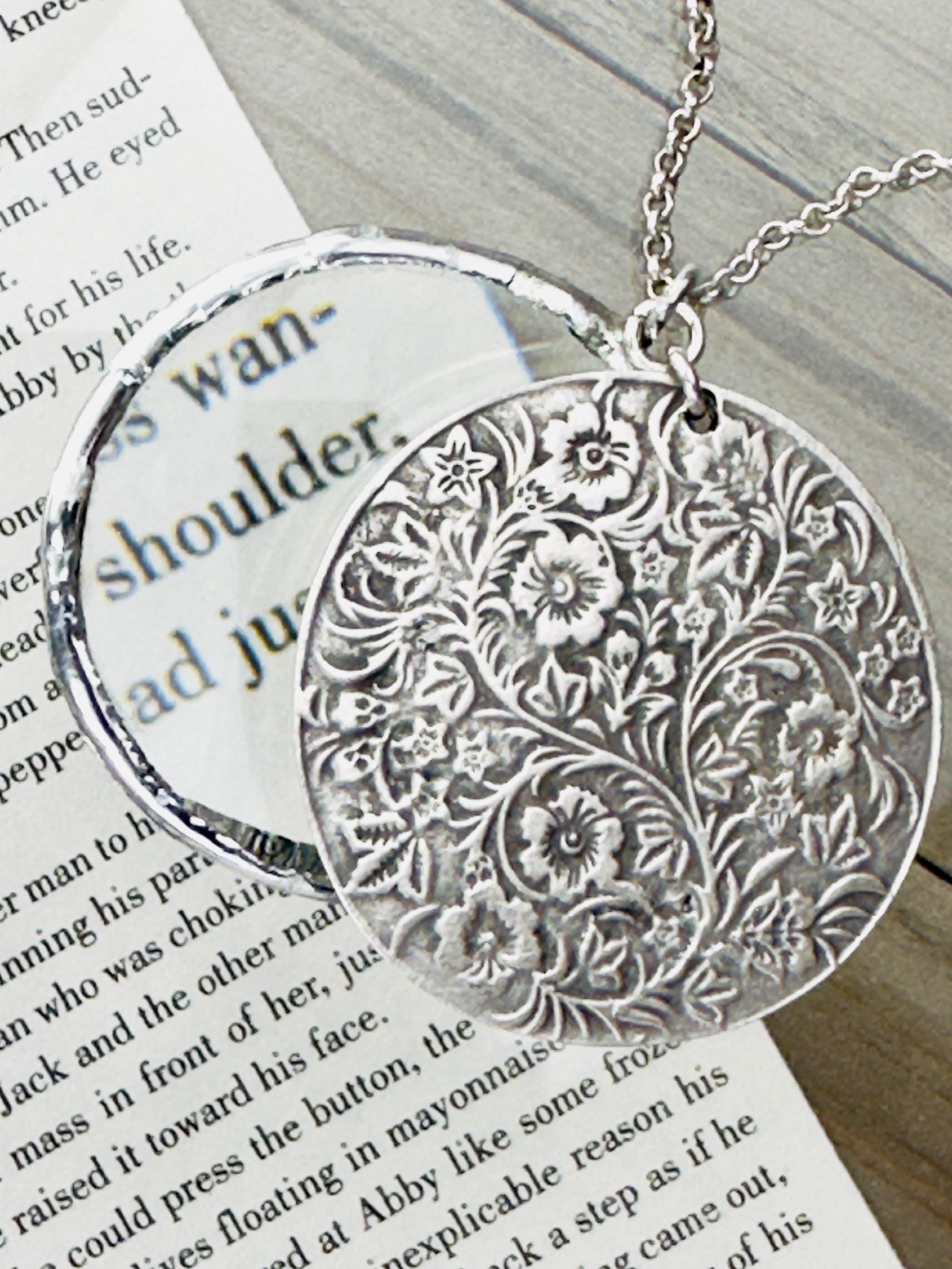 This magnifying necklace is not only fashionable it is also convenient for viewing your phone, menus, price tags, etc. So leave your reading glasses at home because this is your modern solution to the monocle. Hand made in the USA using artisan methods with Sterling silver materials.
