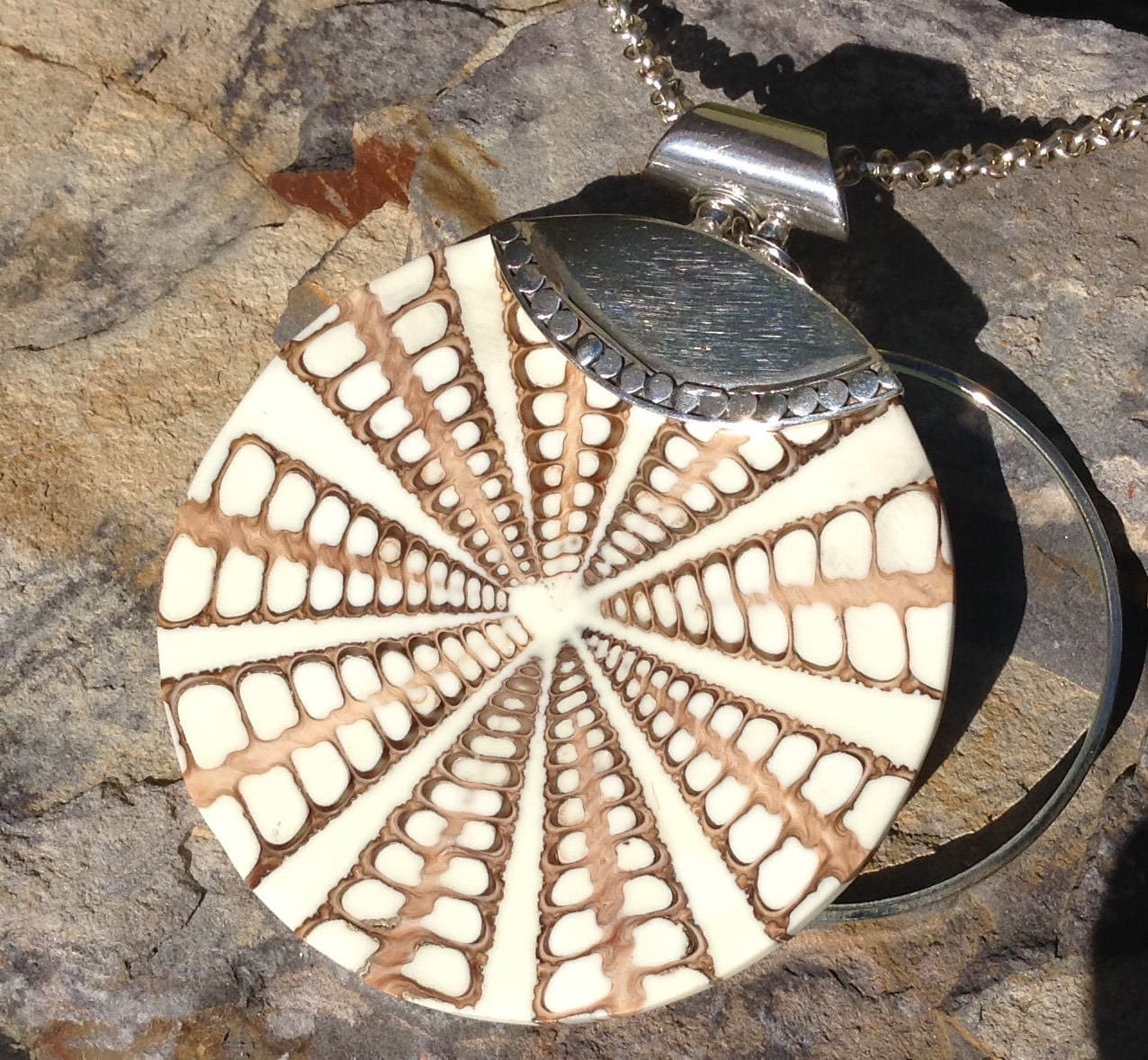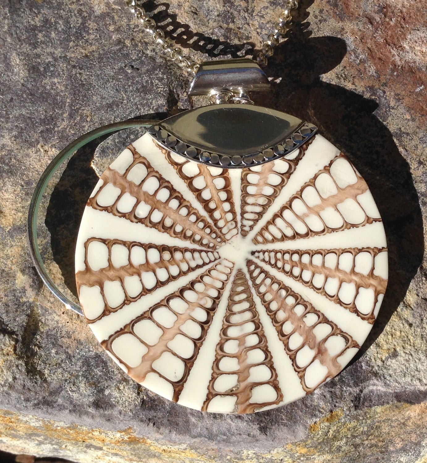 This Magnifying Glass Necklace with Sterling Silver and Shell Pendant will allow you to see your phone, menus, price tags or whatever you usually need you reading glasses with. The beautiful pendant covering the magnifying glass is made of sliced cone shells and measures 2 1/2 inches. It is topped with sterling silver in an half circle shape and finished with a silver 1/2" bail for a very elegant look. The magnifying glass is 5X magnification with a sturdy silver frame, it measures 1 3/4". These are hung together on a 30" silver rolo style chain allowing plenty of room to view whatever is necessary.