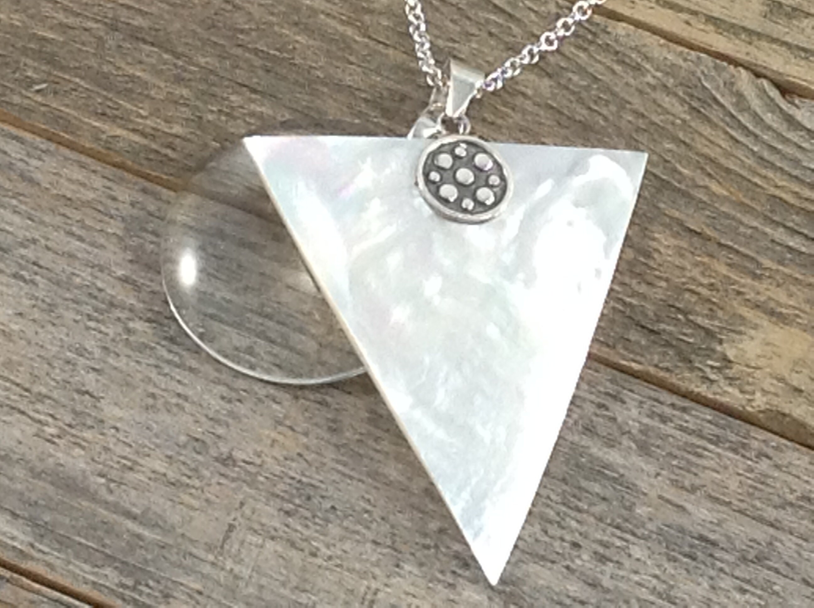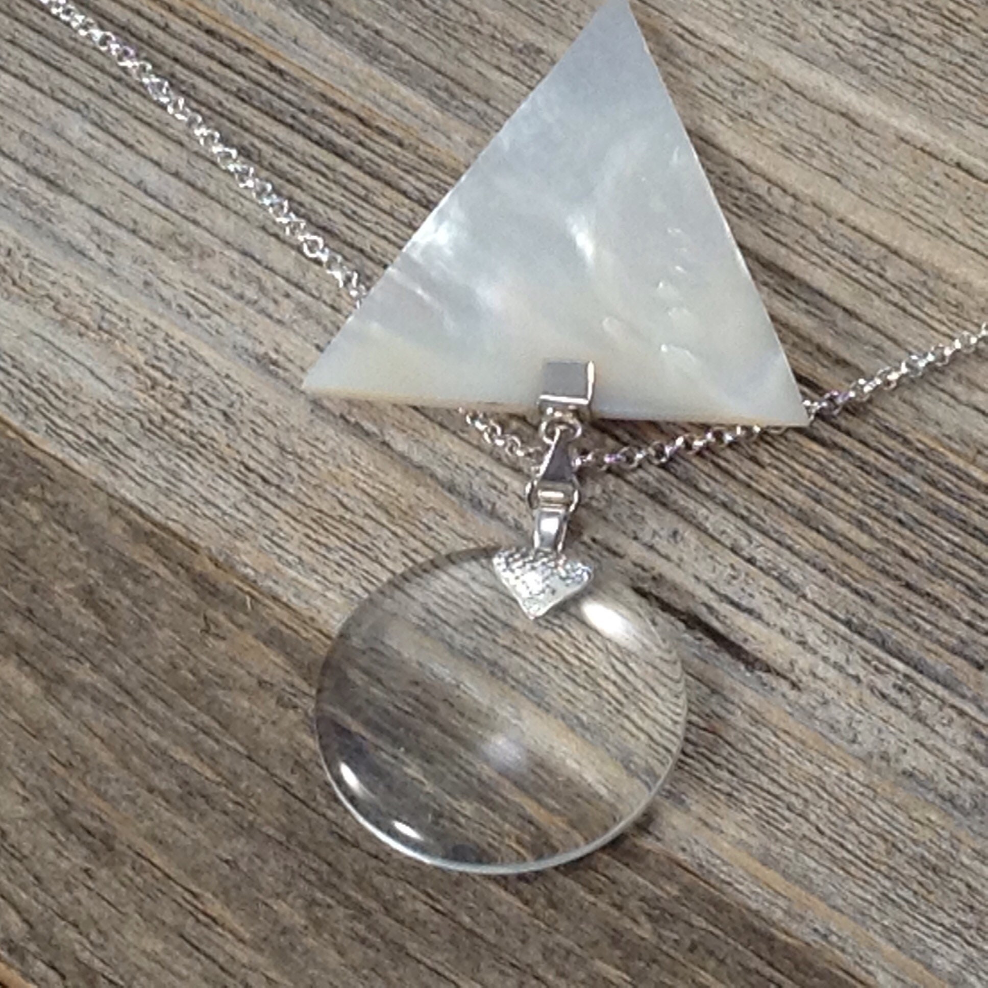 This Magnifying Glass Necklace with Sterling Silver and Mother of Pearl Pendant is very convenient when viewing menus, price tags or reading your phone. This magnifying glass is covered by a mother of pearl pendant with sterling silver details. The pendant measures 2" X 2 1/2" and the magnifying glass is 1 1/2" and is 5X magnification. The chain is a rolo style and measures 30 inches - allowing plenty of room to see whatever you need.