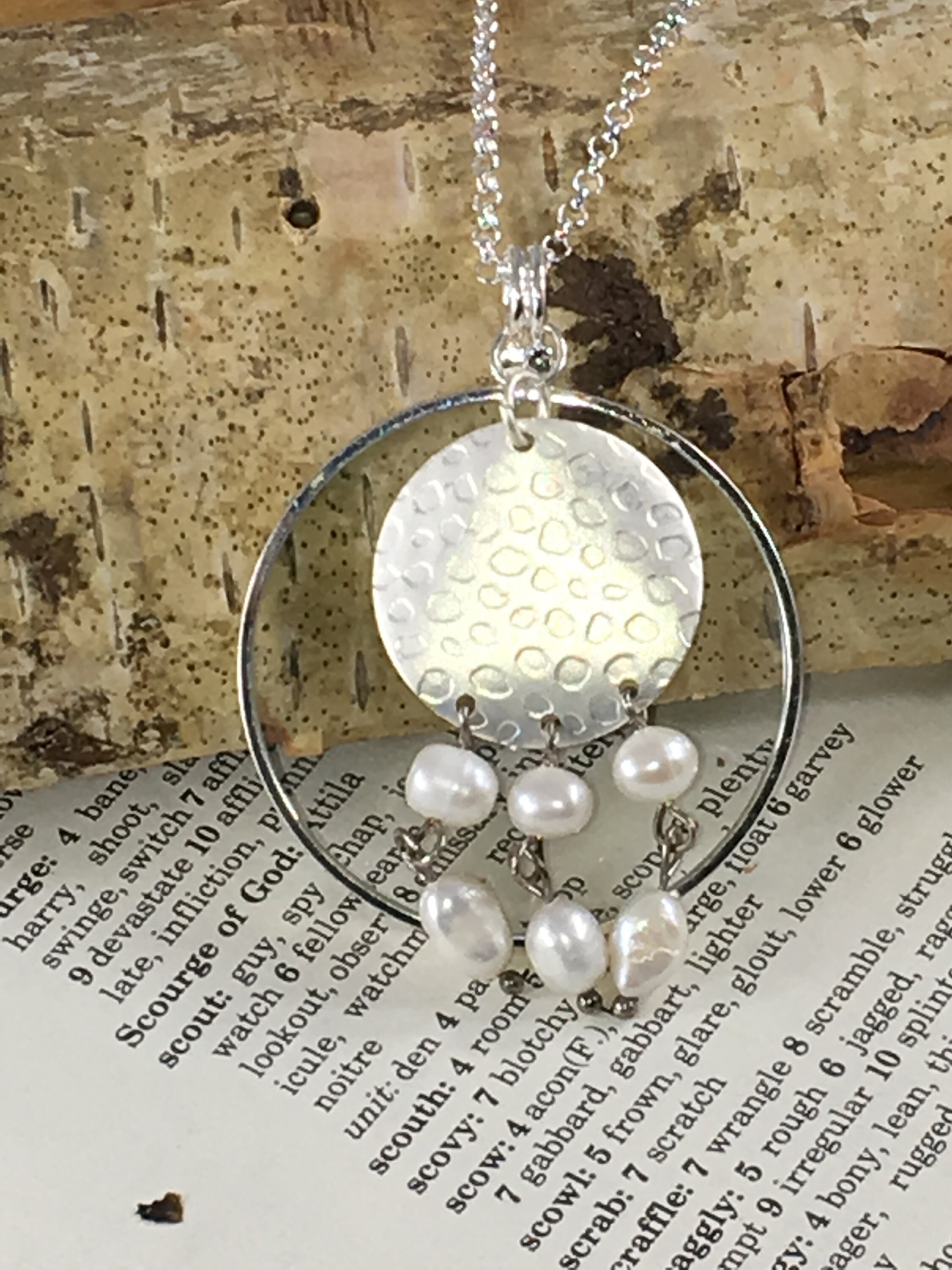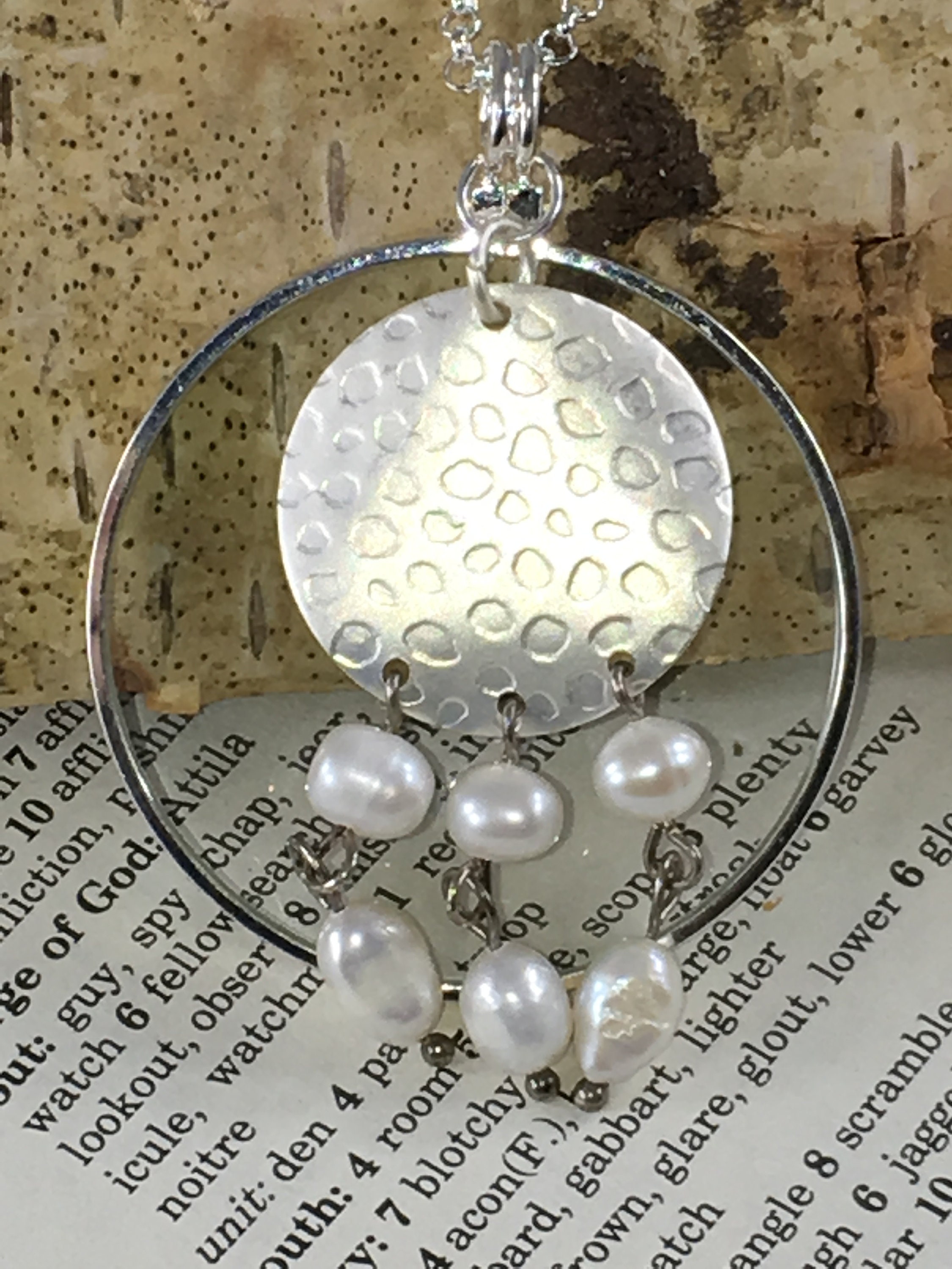 This Magnifying Glass Necklace has a silver circle with three pearl charms making it very convenient when viewing menus, price tags or reading your phone. The magnifying glass is 1 3/4 inches and is 5X magnification. The chain is an antique rolo style and measures 30 inches - allowing plenty of room to see price tags, menus, etc.