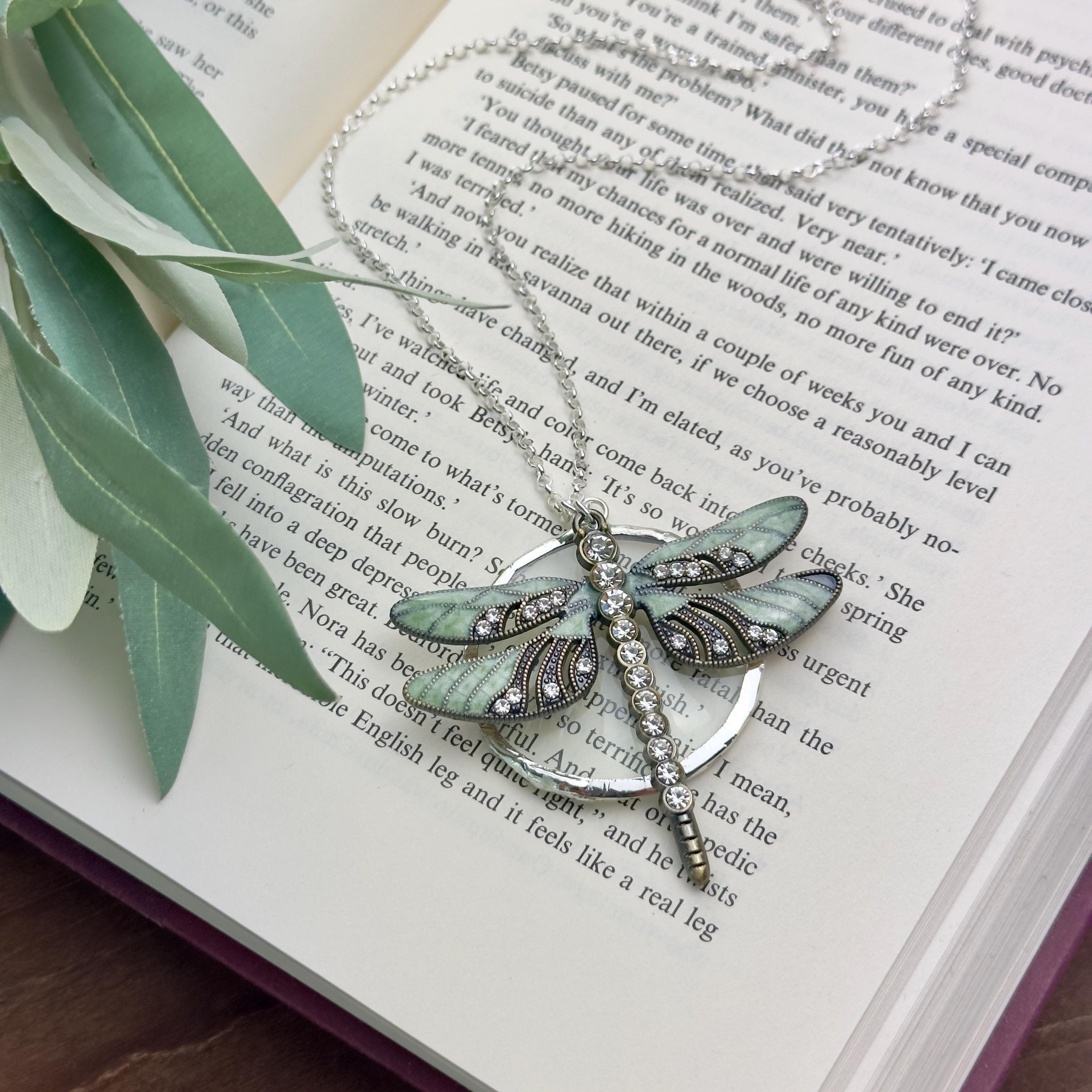 o Decorative grey/green cloisonne dragonfly pendant with rhinestone detailing. Slides to the side for viewing.