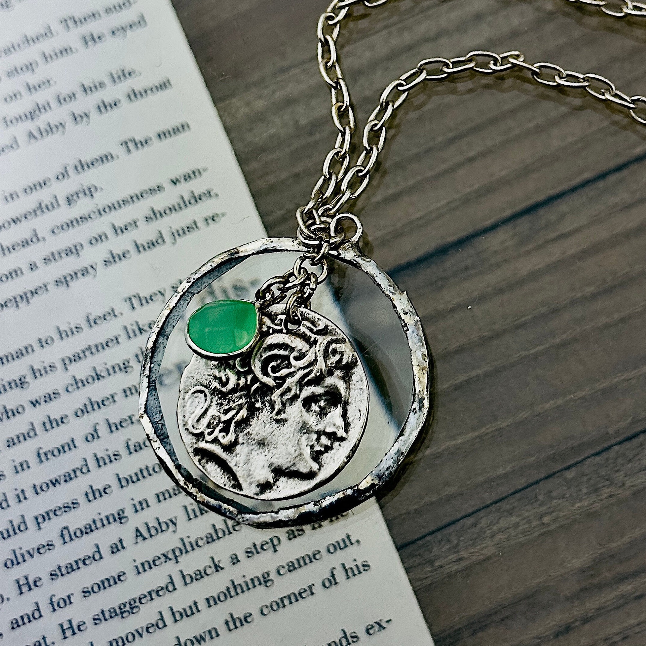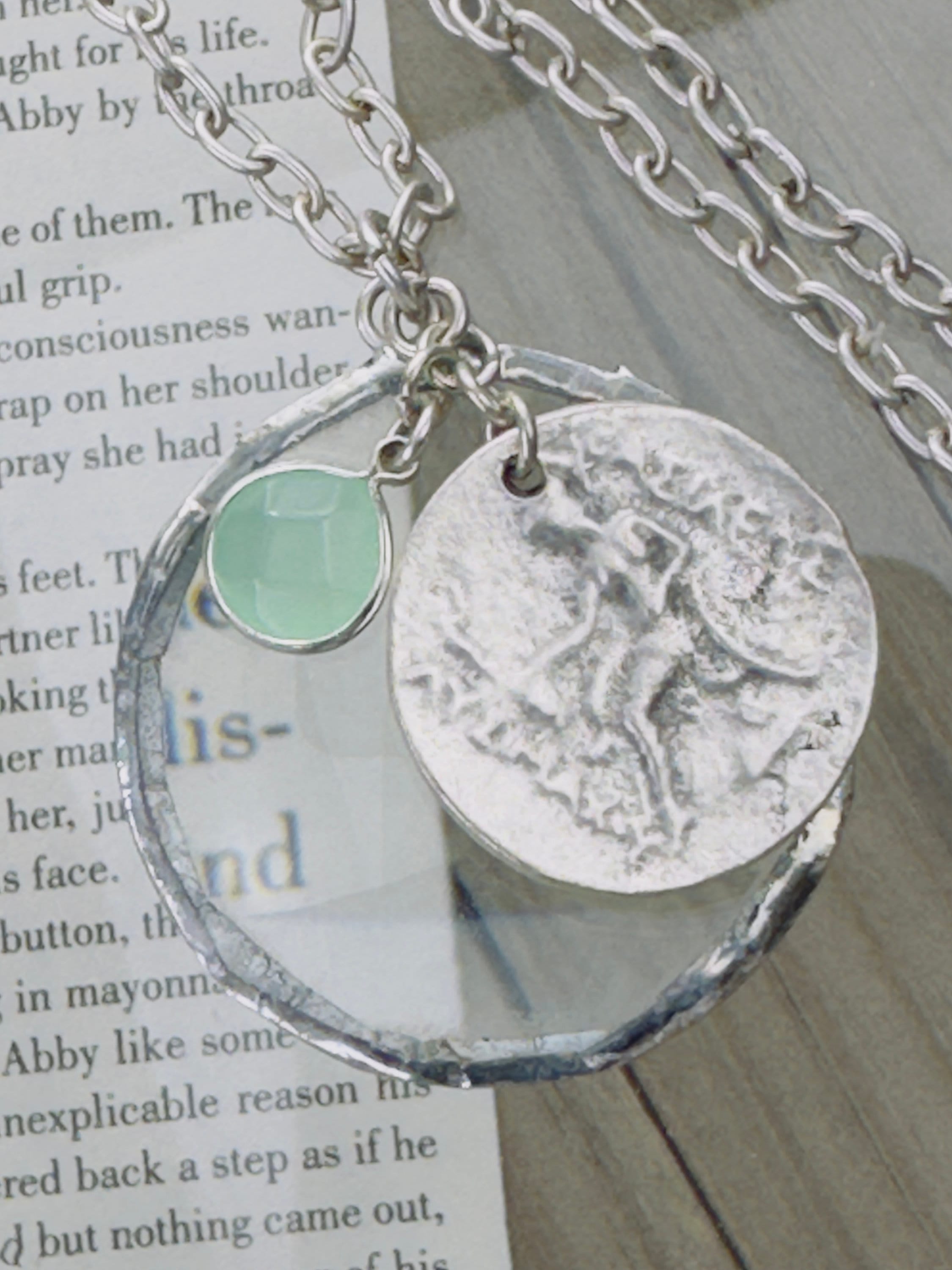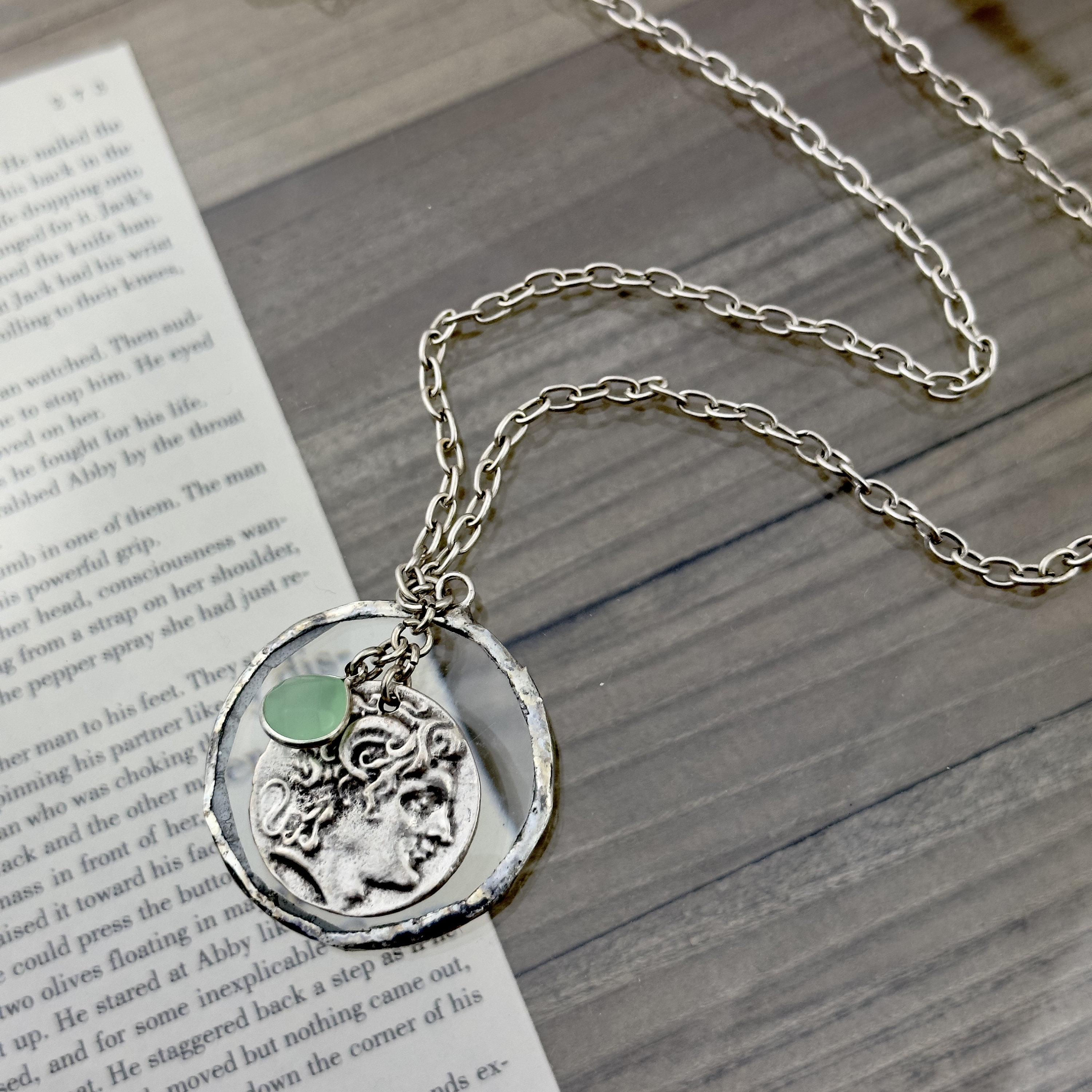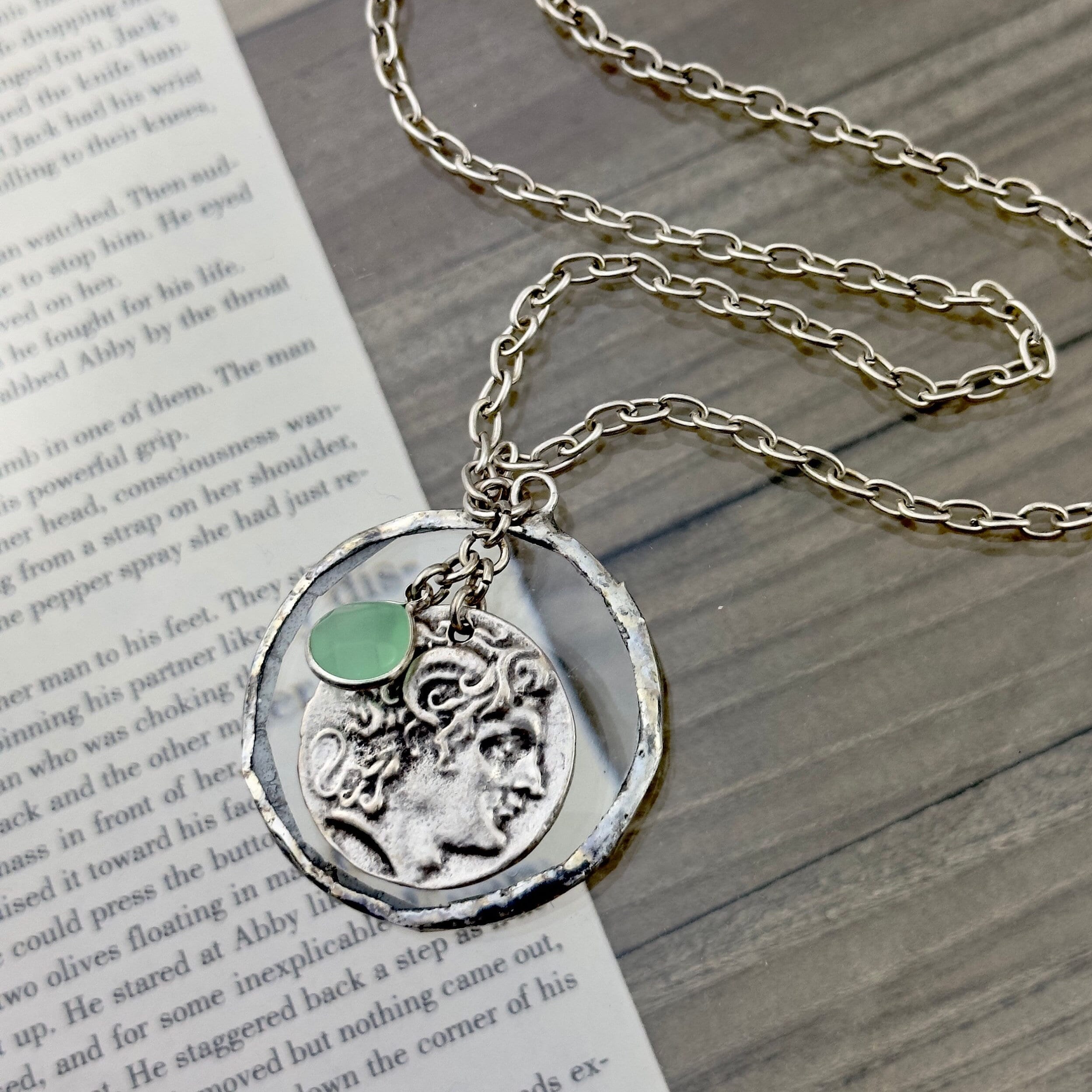o Decorative coin pendant in silver plated metal. Silver framed gemstone of your choice.